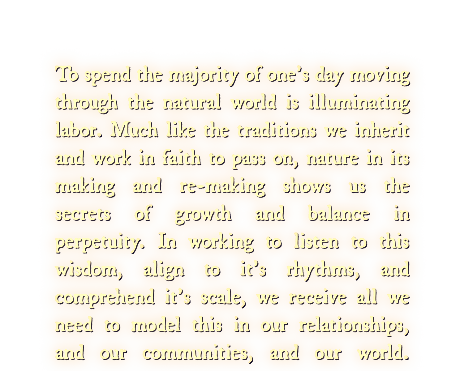 Reconnecting to our ability to influence the world aided solely by community is at once an effort towards nonviolence and democracy. To work intentionally against the extractive, asymmetric over-culture of society is to find, wherever feasible, ways to live without the force multipliers that make violence inevitable. True coexistence will be born from a system in which each voice matters as much as the other, and actively works against the masses of power that deny this.